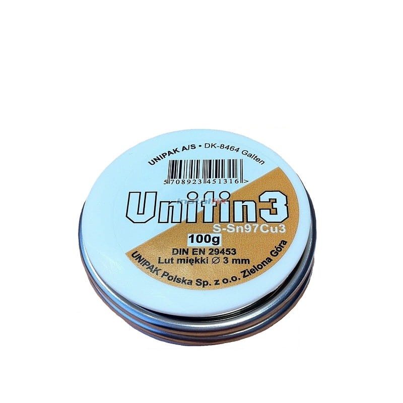 Skład chemiczny Sn(cyna) 97% Cu(miedz) 3 %, nie zawiera ołowiu. Temperatura topnienia 230°C - 250°C.