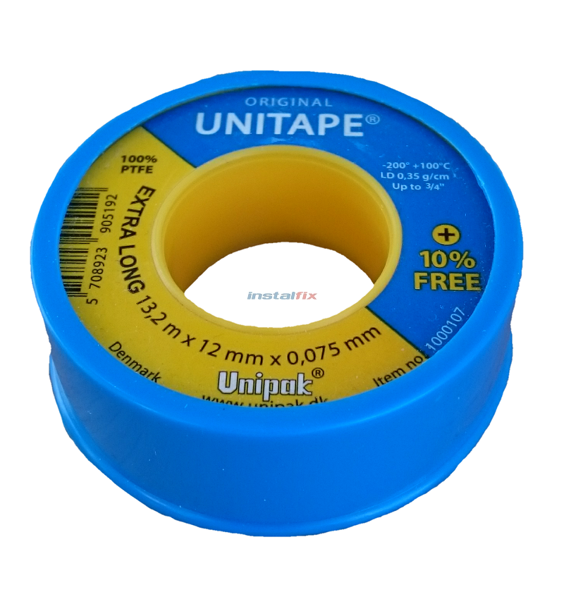 Unitape +10% (13,2m x 12mm x 0,075mm LD gęstość 0,35 g/cm3) – teflonowa taśma uszczelniająca, taśmę można stosować do uszczelniania wszelkiego rodzaju połączeń gwintowych w instalacjach wodnych, CO, benzynowych, olejowych oraz w systemach hydraulicznych i chłodniczych. Taśmę można stosować do ¾" przy temperaturach od -200°C do 100°C i maksymalnym ciśnieniu 20 barów.